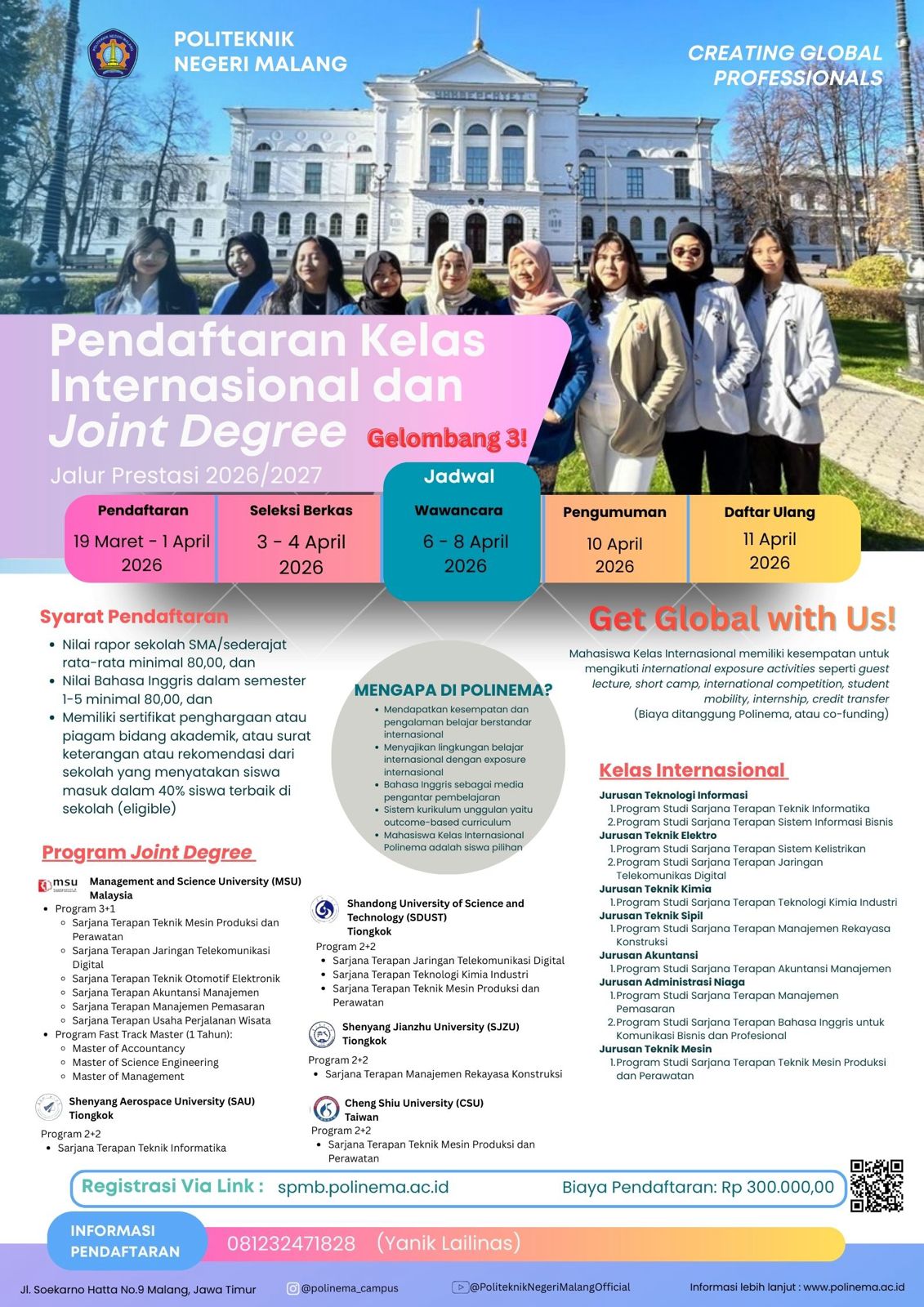 Raih kesempatan bergabung dengan Politeknik Negeri Malang melalui Program Kelas Internasional Jalur Prestasi Gelombang 3